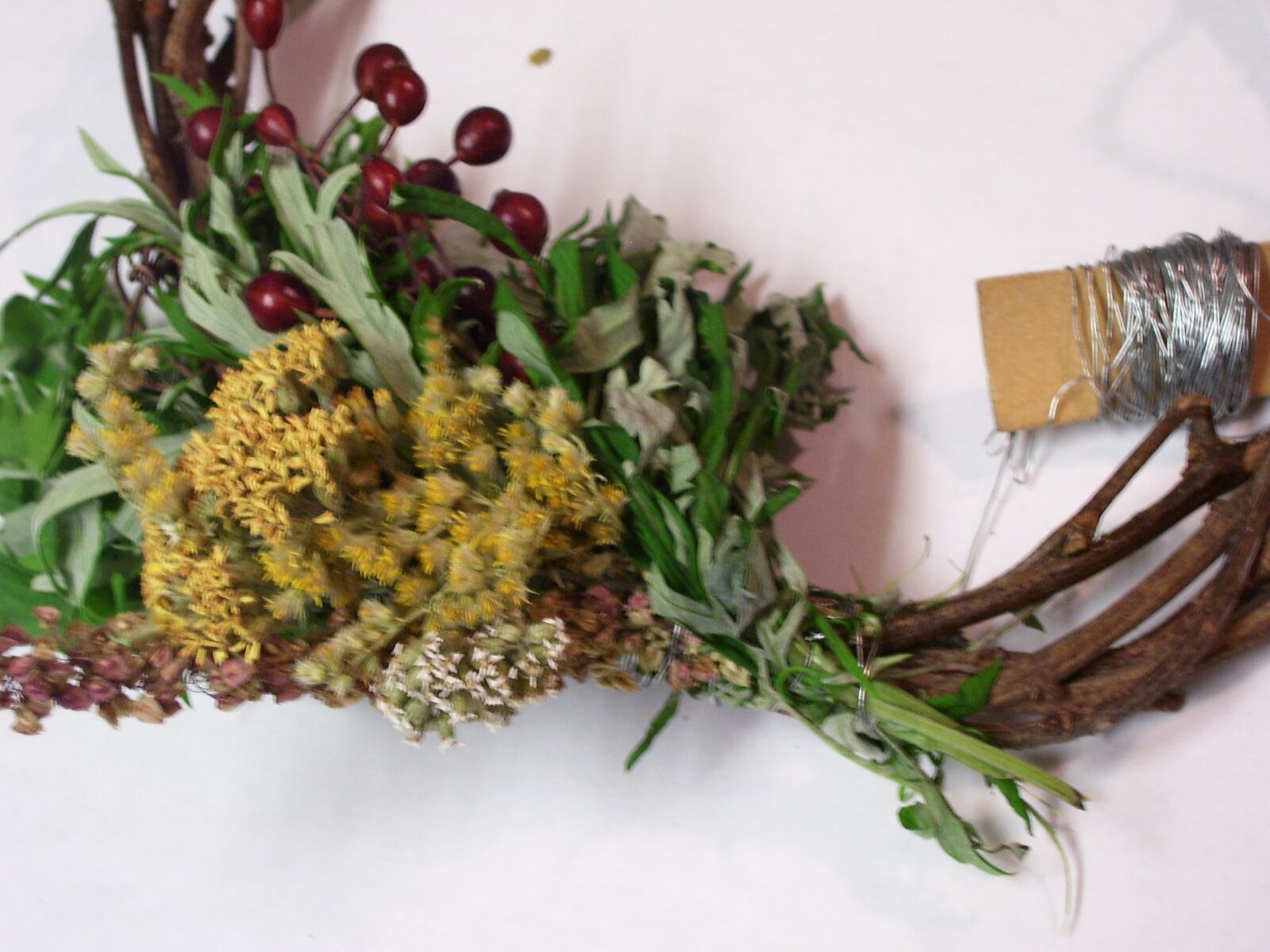 fourth bunch of herbs on wreath base Published June 29, 2015 at 1600 × 1200 in Making an Herbal Wreath From Gathered and Foraged Plants, Part 1 The fourth bunch of herbs on the inside of wreath base.