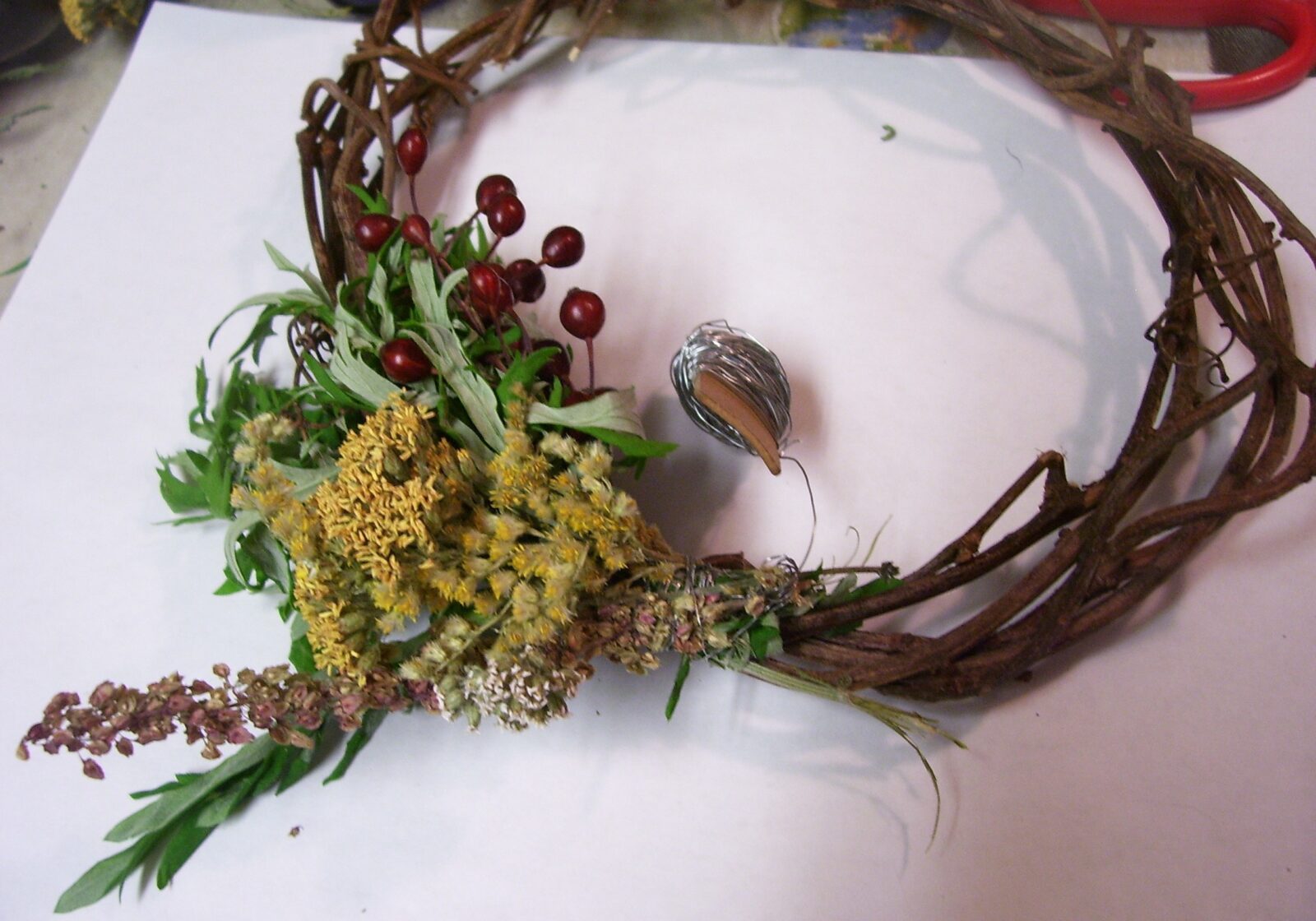 third bunch of herbs on wreath base Published June 29, 2015 at 1600 × 1120 in Making an Herbal Wreath From Gathered and Foraged Plants, Part 1 The third bunch of herbs on outside of wreath base.